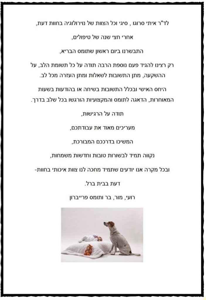 הטיפול נמשך כחצי שנה לאחר שהסימנים נעלמו ובבדיקה חוזרת נראה כי התהליך הדלקתי במוח נעלם, כך שיכולנו לגמול את תומס מהטיפול.